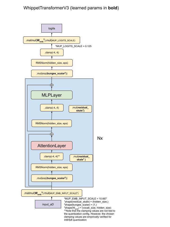 Virtual scalars (Bungee) - In order to stabilize int8 training, virtual scalars are introduced to allow the model to express a wider range of activations and gradients. This is mostly helpful for smaller models.