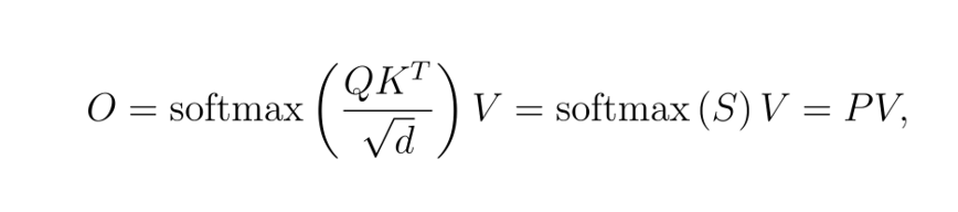 where Q, K, and V are the query, key, and value tensors, d is the head size, S and P are the score logits and probabilities, and O is the attention output. This formula is implicitly parallelized over the number of batches and heads in QKV.