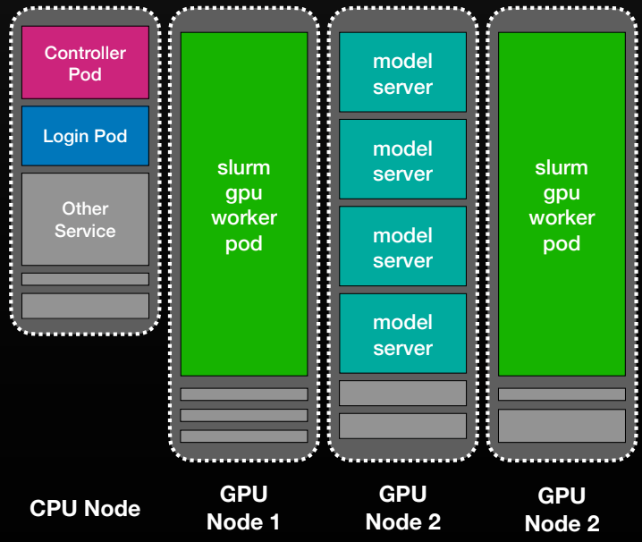 The controller pods run slurmctld; worker pods run slurmd; login pods provide SSH access and a familiar research environment. Other workloads can co‑exist on the same physical machines.